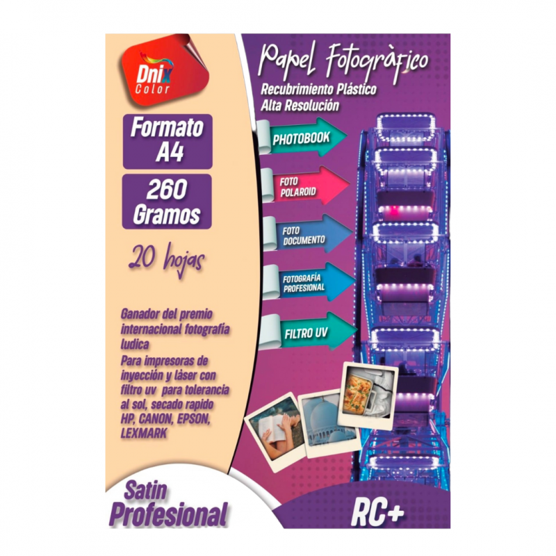 Papel fotográfico sin adhesivo para impresión con tintas inkjet. Resistente al agua y con filtro UV. Tamaño: A4 210x297 mm Grueso del papel: 260 gramos. Acabado: Satinado premium. Resma por 20 hojas.